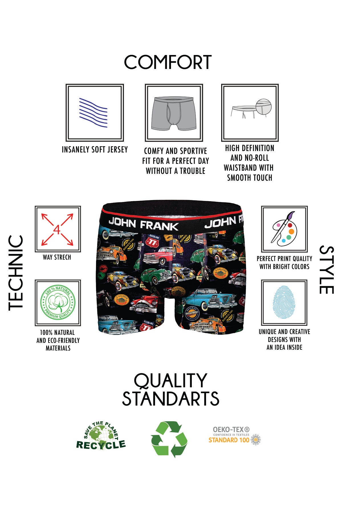 Die Boxershorts für Herren von John Frank bestehen aus hochwertiger Baumwolle und bieten optimalen Tragekomfort sowie Funktionalität. Das elastische, atmungsaktive Material liegt weich auf der Haut und sorgt den ganzen Tag über für ein angenehmes Gefühl. Ein elastischer Bund mit John-Frank-Logo gewährleistet nicht nur perfekten Sitz, sondern verleiht den Boxershorts auch eine sportlich-moderne Optik. Die langlebige Verarbeitung garantiert, dass die Passform auch nach vielen Wäschen erhalten bleibt. Erhältlich in klassischen Farben wie Schwarz, Weiß und Dunkelblau, lassen sie sich vielseitig kombinieren – ob im Business-Alltag oder in der Freizeit. Mit ihrem zeitlosen Design und hohem Komfort sind sie die ideale Wahl für stilbewusste Männer.